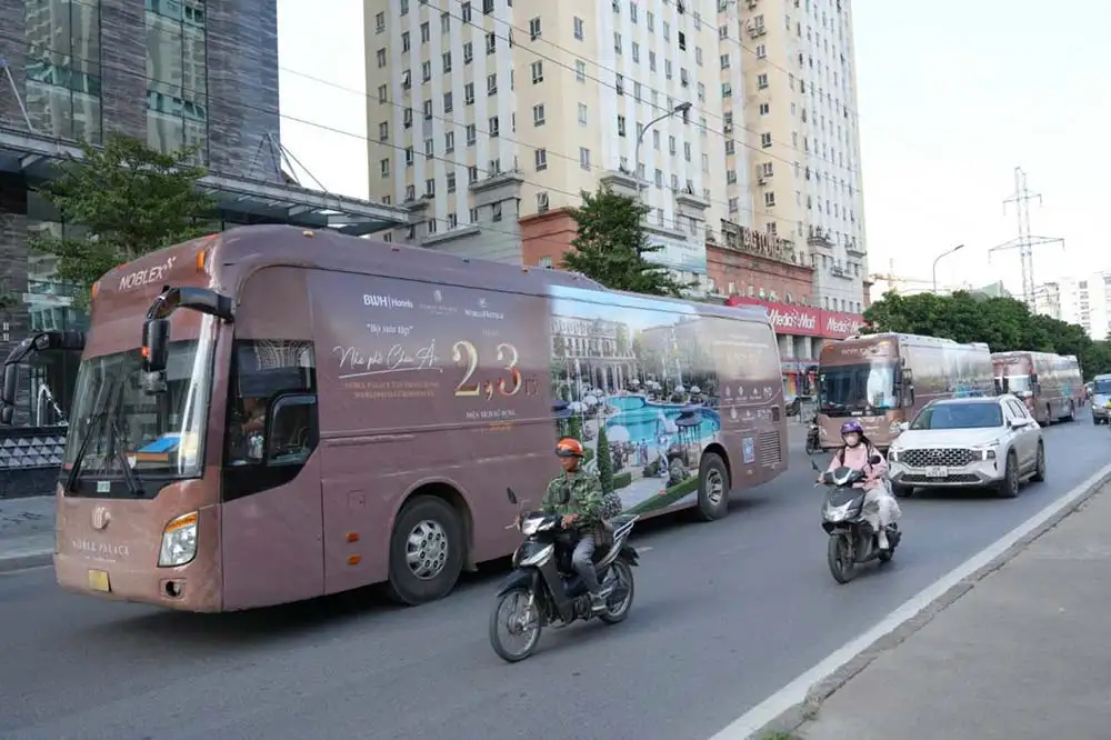 - Hiệu ứng nối đuôi (Convoy): Việc đoàn xe 45 chỗ nối đuôi nhau di chuyển chậm tại các khu vực đông đúc giúp kéo dài thời gian tiếp xúc của khách hàng với thông điệp quảng cáo, tạo ấn tượng sâu đậm về một dự án quy mô, uy tín và có sự đầu tư bài bản.