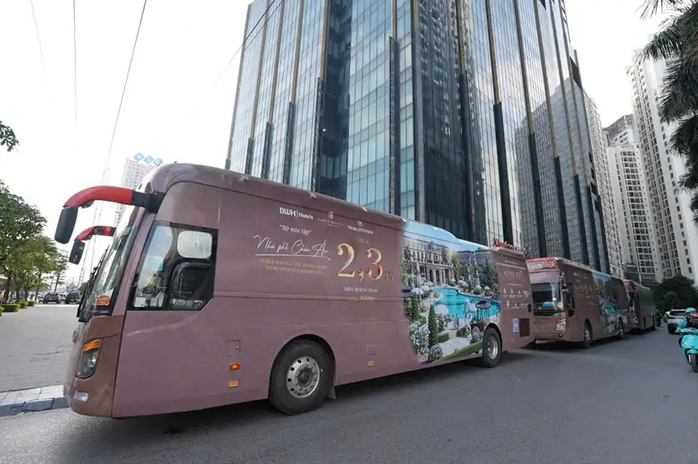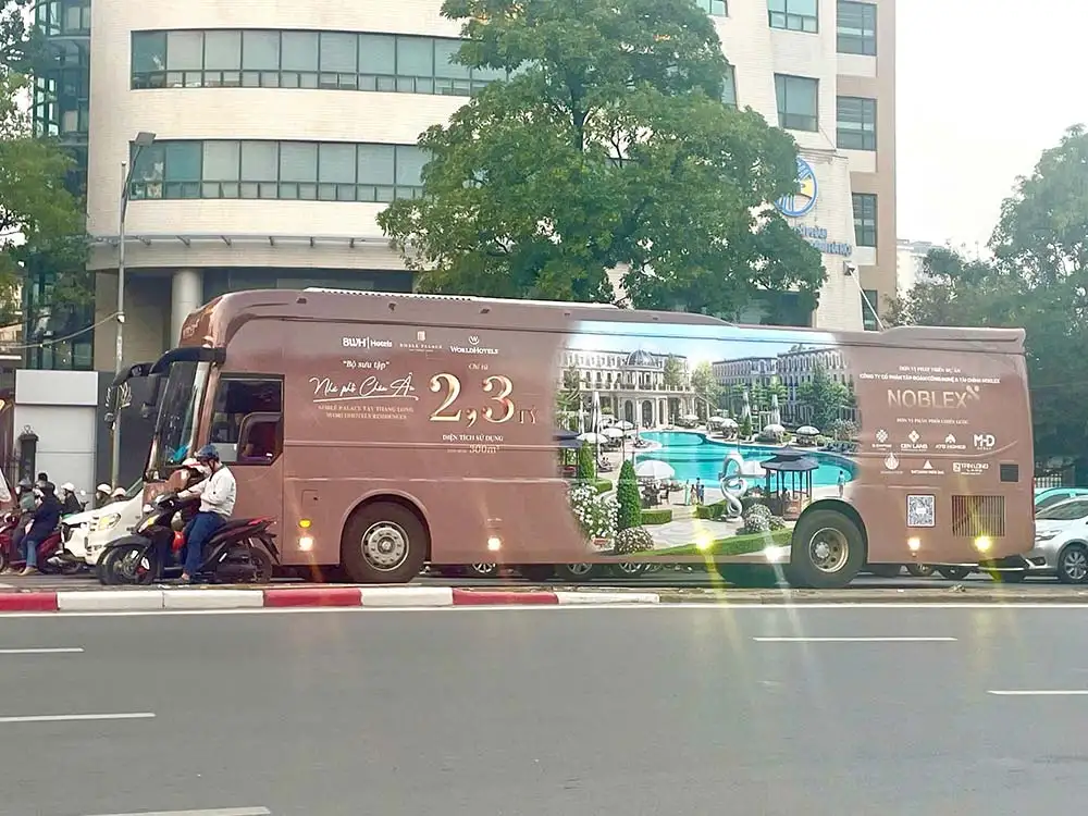- Hình thức: Quảng cáo Roadshow OOH trên dàn xe 45 chỗ hạng sang (Luxury Bus), dán decal kín thân xe (full body) với hình ảnh phối cảnh dự án đẳng cấp.